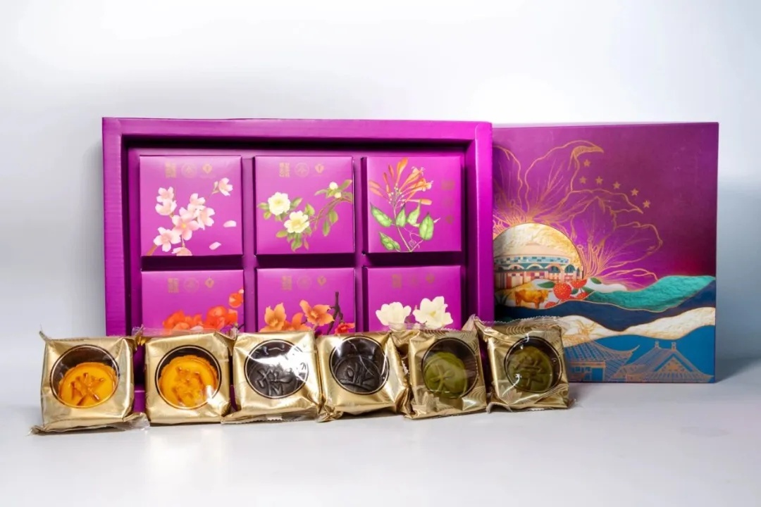 “花好月圆”礼盒以紫红为主色调