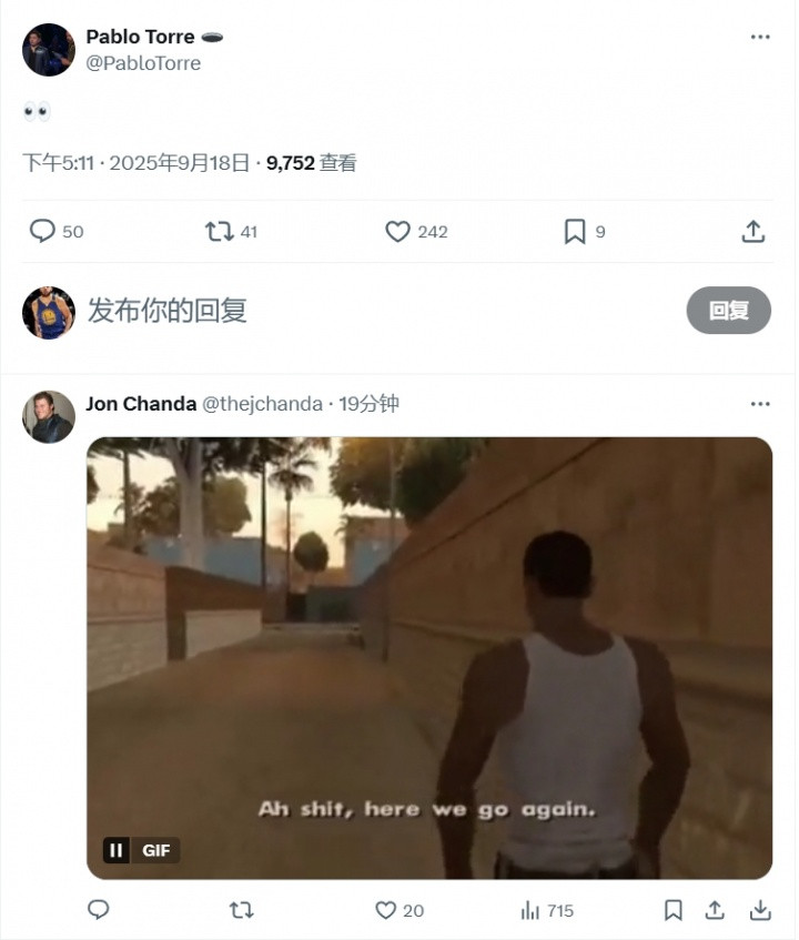 直播吧09月18日讯 小卡涉嫌阴阳合同爆料记者Pablo Torre不久前更推,晒出一个“👀”的表情包。